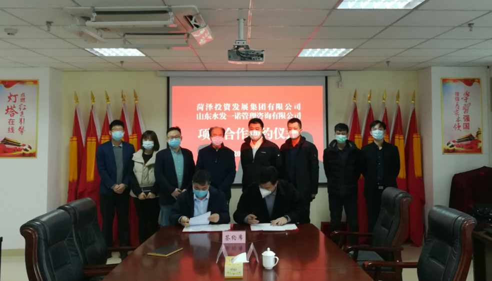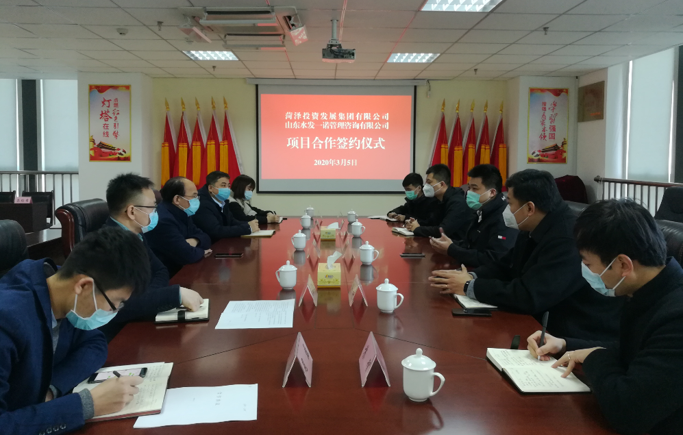 2020年3月5日上午,菏澤投資發(fā)展集團有限公司與山東水發(fā)一諾管理咨詢有限公司項目合作簽約儀式在菏投集團公司第二會議室舉行,菏投集團公司黨委副書記、總經(jīng)理丁萬國與水發(fā)一諾董事長商亮代表合作雙方簽訂《項目合作協(xié)議》。菏投集團黨委書記、董事長徐文芹,黨委委員、副總經(jīng)理肖培飛,水發(fā)全程咨詢集團有限公司副總經(jīng)理張世朝,水發(fā)一諾董事長商亮,總經(jīng)理劉建勛等有關(guān)人員參加了座談與簽約儀式。