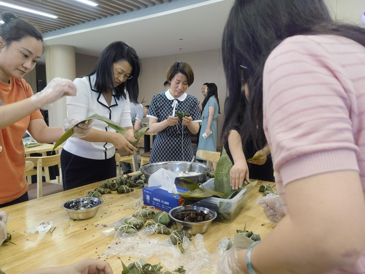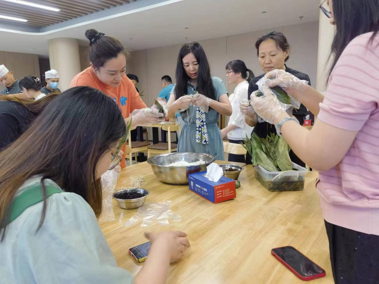 活動現(xiàn)場,工作人員精心準(zhǔn)備了活動所需食材,餐廳面點師為大家講解及演示粽子的做法,大家齊動手、共參與,拿粽葉、捋粽葉、制漏斗、填糯米、放紅棗、裹葉子,邊分享邊交流,濃濃的粽香味瞬間鋪滿了整個場地。