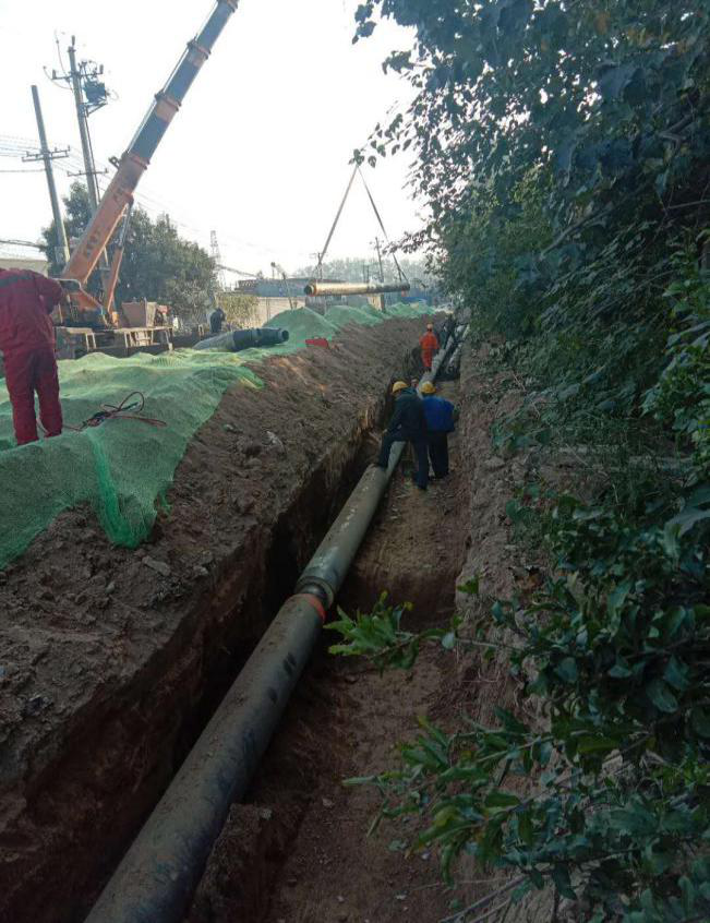 為了能夠讓電廠家屬院能夠在供暖季正常用暖,公司對該項(xiàng)目工地實(shí)行分段施工,分班次、加班加點(diǎn)搶工期。10月上旬完成了電廠北門溝槽的開挖工作,10月16日起,開始向溝槽下放熱力管道。