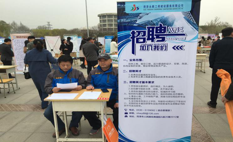 為深入貫徹落實(shí)山東省招商引資招才引智工作會(huì)議精神和菏澤市委市政府招才引智重大部署、舉措,深入推進(jìn)人才發(fā)展體制機(jī)制改革,培育公司發(fā)展新動(dòng)力,按照永順公司招才引智工作方案,3月29日,永順工程公司參加了“2019菏澤市人才大集”活動(dòng),招賢納士。