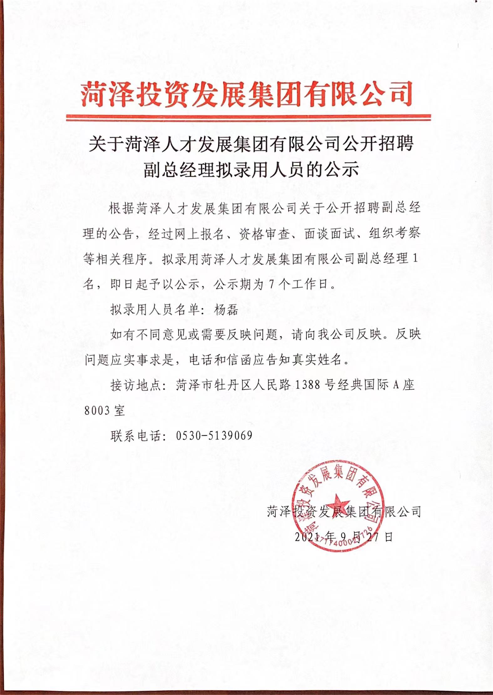 關于菏澤人才發(fā)展集團有限公司公開招聘副總經(jīng)理擬錄用人員的公示