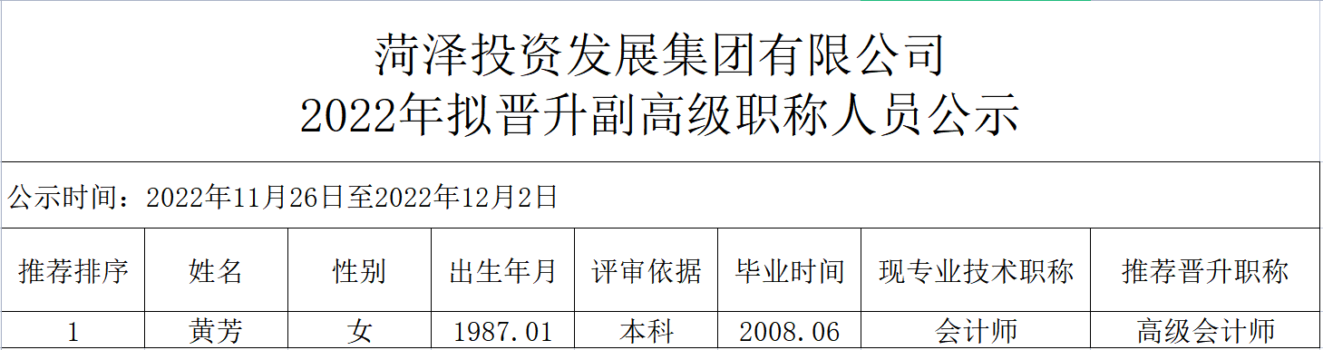菏澤投資發(fā)展集團(tuán)有限公司2022年擬晉升副高級(jí)職稱人員公示